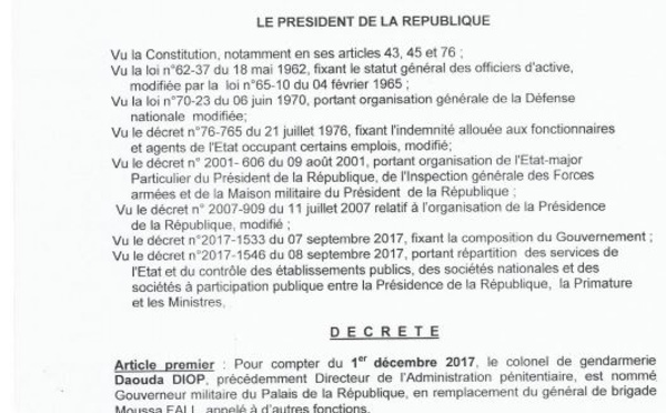 Un changement dans la sécurité présidentielle. Selon un décret, le Colonel Daouda Diop va désormais occuper le poste de Gouverneur militaire du Palais. Le général Moussa Fall appelé à d'autres...