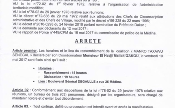 Le rassemblement de la coalition Mankoo Taxawu Senegaal qui se déroulera au Boulevard Général de Gaulle x rue 25 Médina, est prévu, selon l’arrêté préfectoral, à 15 heures et la dislocation à 19...
