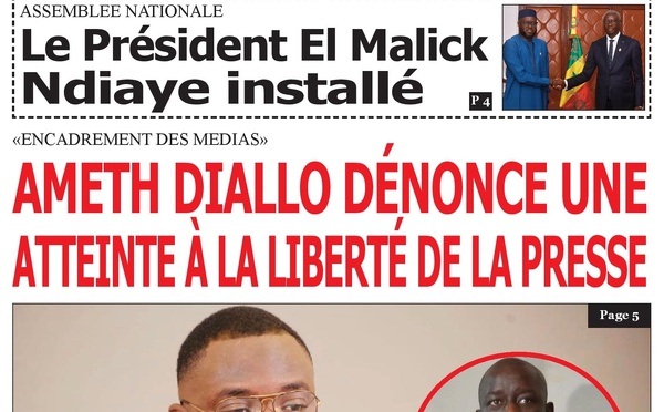 La une du journal Le Réveil du 5 décembre 2024 traite de l’installation d’El Malick Ndiaye comme Président de l’Assemblée nationale et des critiques d’Ameth Diallo, coordinateur de la coalition Gox...