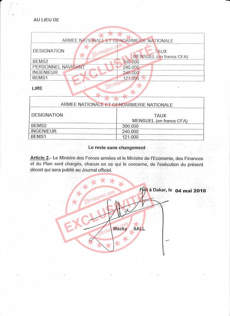Le décret du 04 mai a circulé ces derniers jours à travers les comptes Whatsapp des officiers, avec des commentaires jamais connus au sein de la troupe. Notre armée, connue pour sa discipline, son mutisme et son attachement aux principes républicains, est, cette fois-ci, braquée par une décision qu’elle juge injuste de son chef suprême. Yerimpost.com