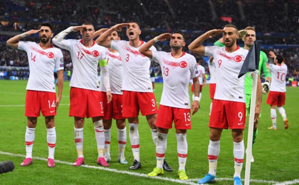 Le salut militaire des Turcs, qui a tant fait parler il y a quatre jours lors du match contre l'Albanie, a encore été utilisé au Stade de France, lors de l'égalisation des visiteurs. (A.Reau/L'Equipe)