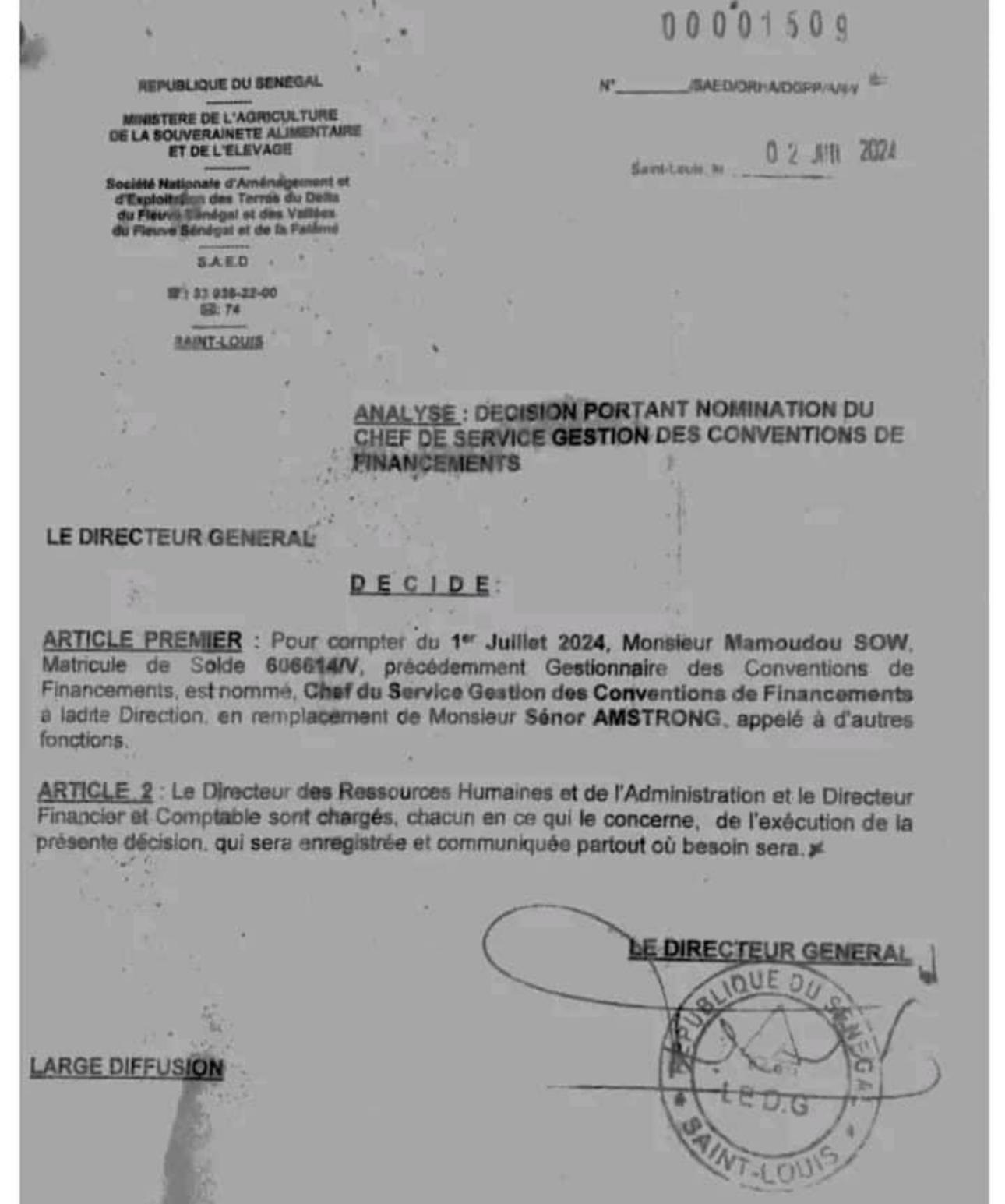 Cependant, le directeur général, Aboubacry Sow, défend fermement cette décision. Contacté par nos confrères de Dakaractu, il a déclaré : « Je confirme que c’est une décision prise au niveau de la direction de la SAED. Je tiens cependant à préciser que, quand le directeur financier est venu me proposer cette nomination, je lui ai posé la question de savoir s’il était le seul à pouvoir accomplir cette tâche. Il m’a répondu qu’il dirait même au ministre de l’Agriculture que si c’était à refaire, il n’hésiterait pas, car il n’a pas d’autre solution. »