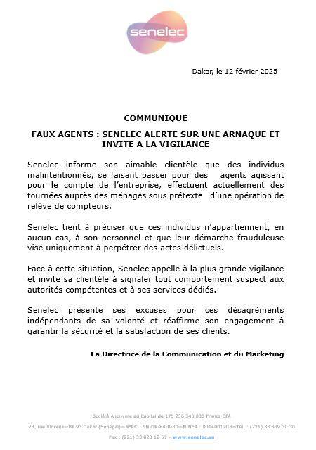 Face à cette menace, la SENELEC exhorte sa clientèle à redoubler de vigilance et à signaler tout comportement suspect aux autorités compétentes. Tout en présentant ses excuses pour ces désagréments, elle réaffirme son engagement à assurer la sécurité et la satisfaction de ses abonnés.