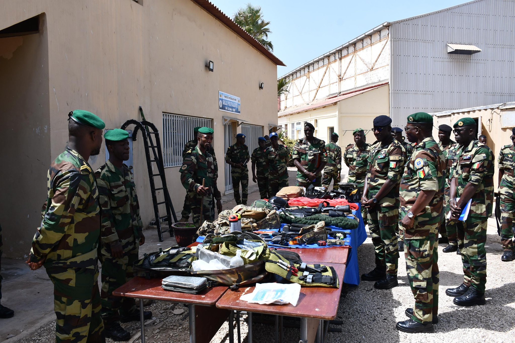 À son arrivée au Camp Général Mountaga DIALLO, le Général CISSÉ a été accueilli par les hauts responsables militaires de la base. Après les salutations d'usage et une inspection de la garde d'honneur, le CEMGA a été invité à assister à une présentation détaillée des équipements et des capacités opérationnelles des Forces Spéciales Mer.