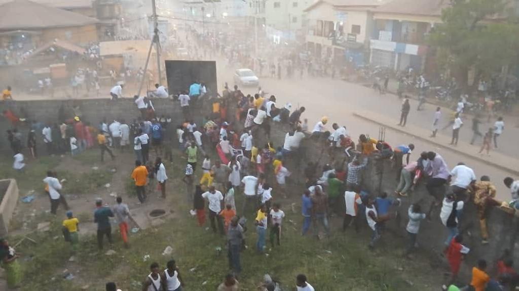 Les visiteurs contestent, s'en prennent à l'arbitre, une échauffourée débute alors que le terrain est envahi : selon des témoins, les forces de l'ordre jettent alors des gaz lacrymogènes. Des jeunes répondent par des jets de pierre. L'affrontement amène à un mouvement de foule vers la seule sortie de l'enceinte.