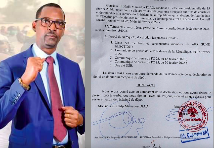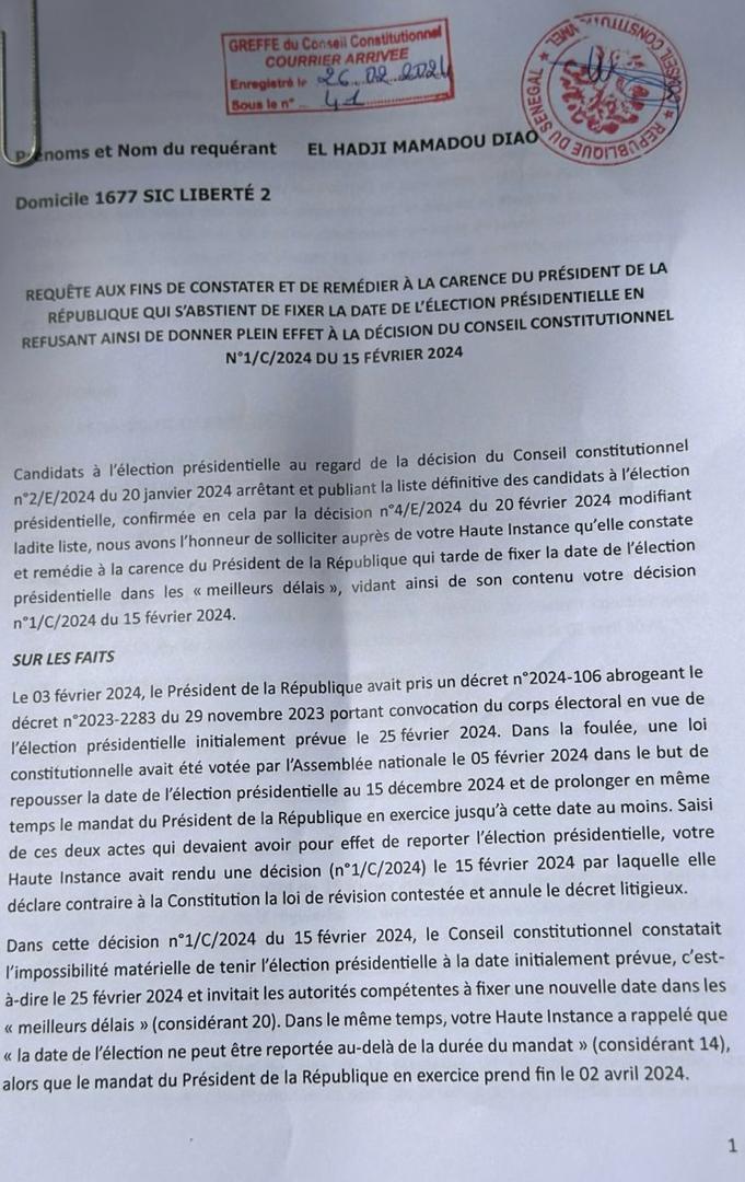 Le candidat El Hadji Mamadou Diao dit Mame Boye Diao a déposé, ce lundi 26 février 2024, " une requête aux fins de constater et de remédier à la carence du Président de la République qui s'abstient de fixer la date de l'élection présidentielle en refusant ainsi de donner plein effet à la décision du Conseil Constitutionnel n°1/C/2024 du 15 février 2024".