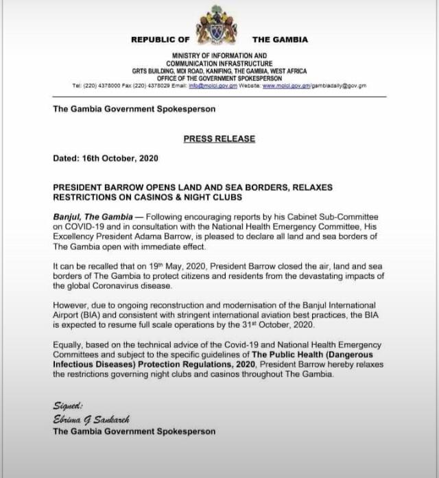 Selon un communiqué du gouvernement du Gambien transmis à Exclusif.net, le président Adama Barro a décidé de rouvrir ses frontières terrestres et aériennes et lève les restrictions sur les boîtes de nuit et les casinos.