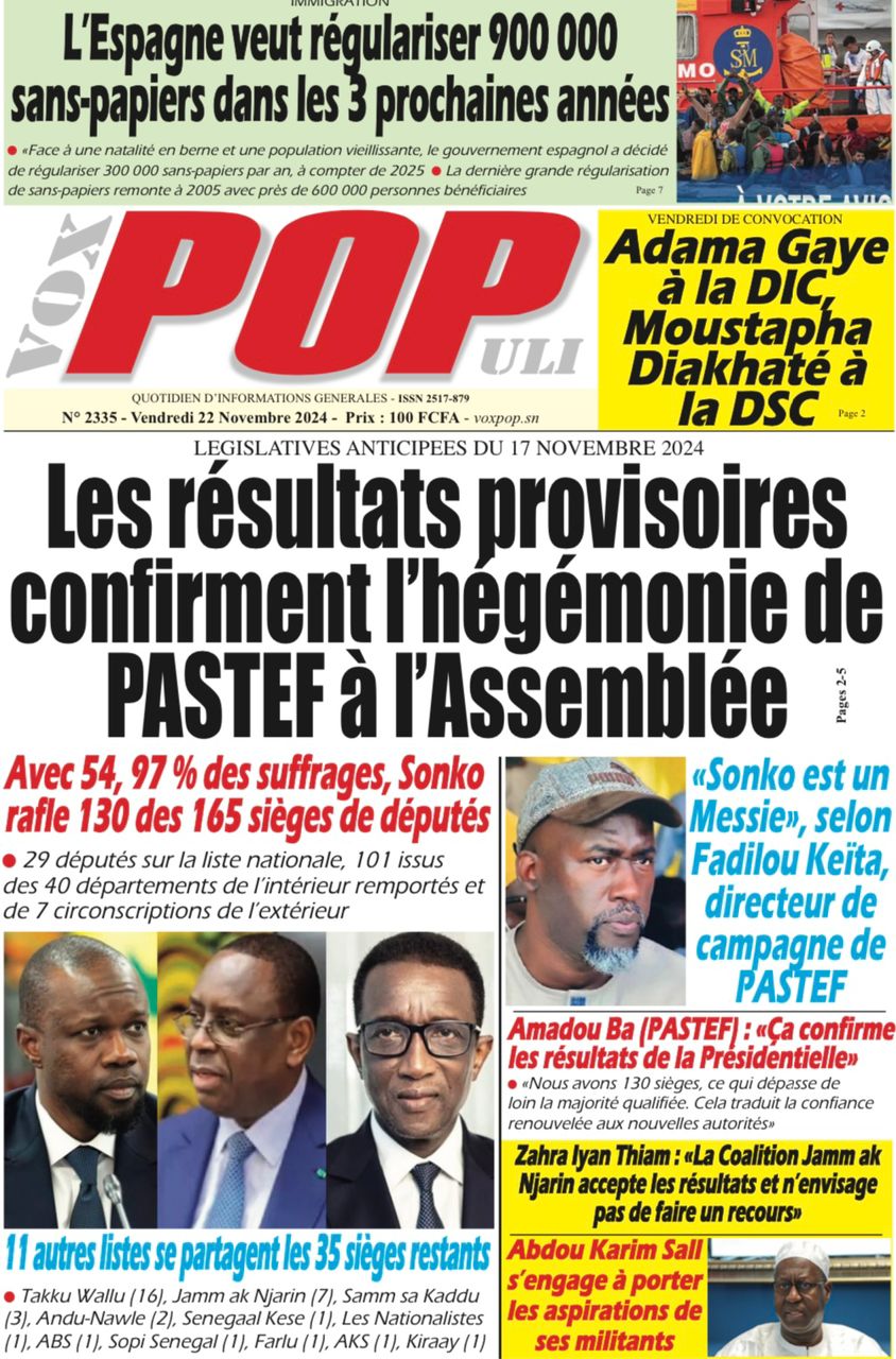 Le journal Le Réveil de ce 22 novembre 2024 met en lumière les bouleversements des législatives de cette année. La coalition « And Nawlé » conteste les résultats à Mbour et annonce un recours, dénonçant des irrégularités.
