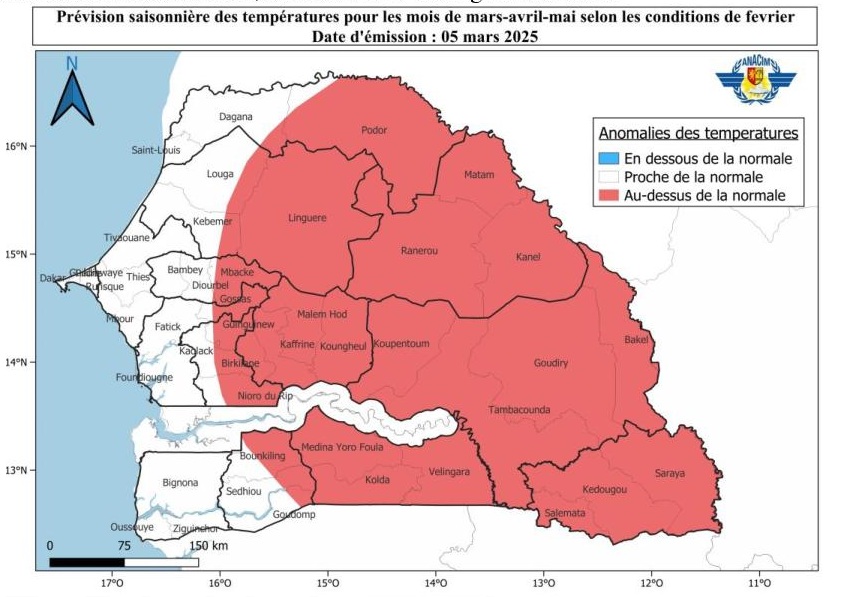 Les régions proches du littoral, notamment Saint-Louis, l’ouest de Louga, Thiès, Dakar, Mbour, Fatick et Ziguinchor, feront exception à cette tendance. Dans ces zones, les températures resteront dans les limites habituelles pour ce trimestre, offrant un répit relatif par rapport à la chaleur intense prévue à l’intérieur du pays.
