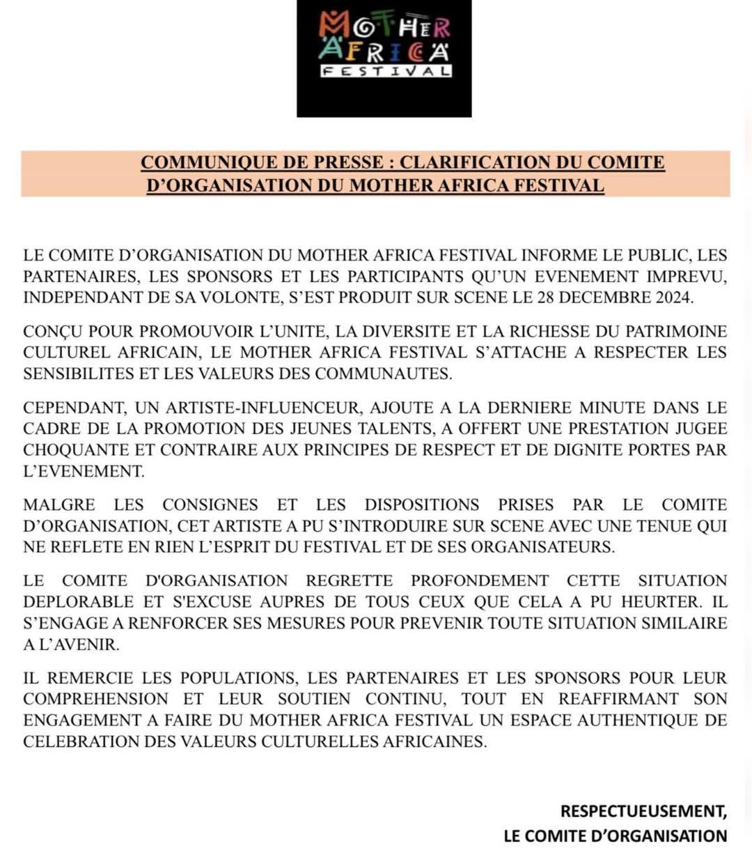 Selon le communiqué officiel publié par le comité d’organisation du "Mother Africa Festival", un artiste-influenceur, « L’Excès », intégré à la dernière minute dans le cadre de la promotion des jeunes talents, a livré une performance jugée choquante et contraire aux principes fondamentaux de respect et de dignité portés par l’événement. L’incident, survenu malgré les dispositions prises par les organisateurs, a provoqué une incompréhension générale. La tenue et l’attitude de cet artiste ne reflétaient en aucun cas l’esprit du festival, déplore le comité.