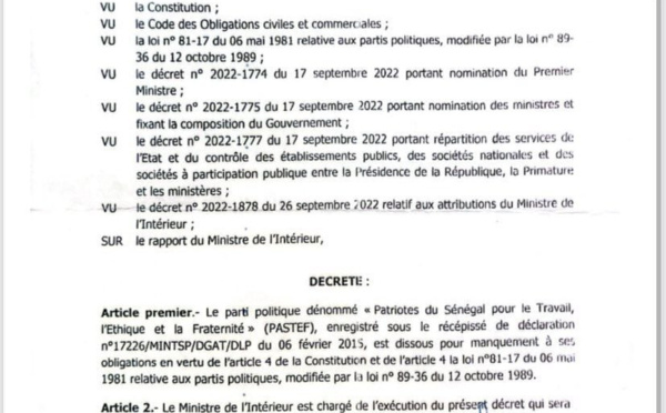 Fin du suspense ! Le décret actant la dissolution du parti Pastef est désormais disponible on vous livre le document officiel signé par le président Macky Sall.