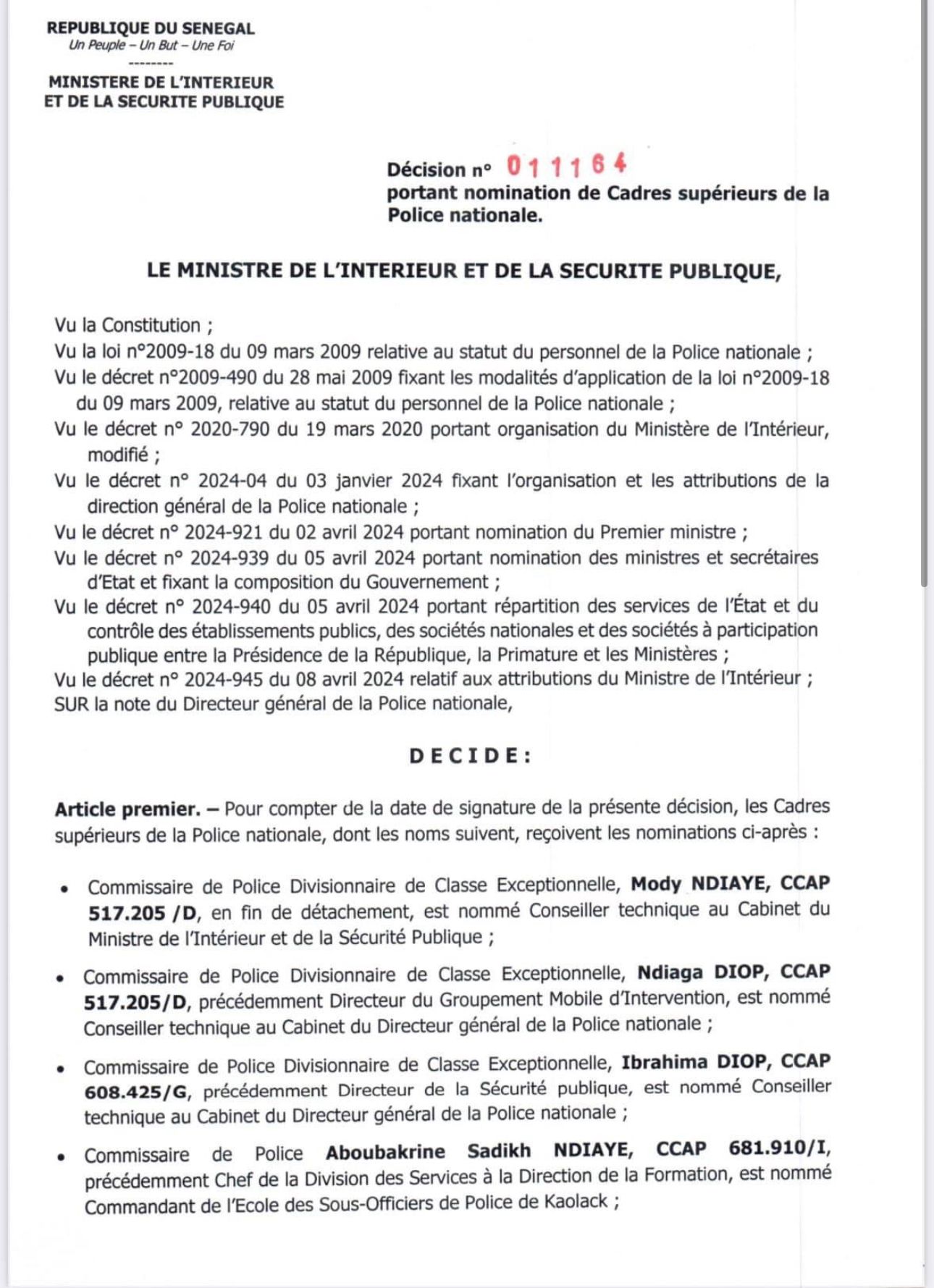 - Commissaire de Police Divisionnaire de Classe Exceptionnelle, Ndiaga DIOP, CCAP 517.205/D, précédemment Directeur du Groupement Mobile d’Intervention, est nommé Conseiller technique au Cabinet du Directeur général de la Police nationale ;