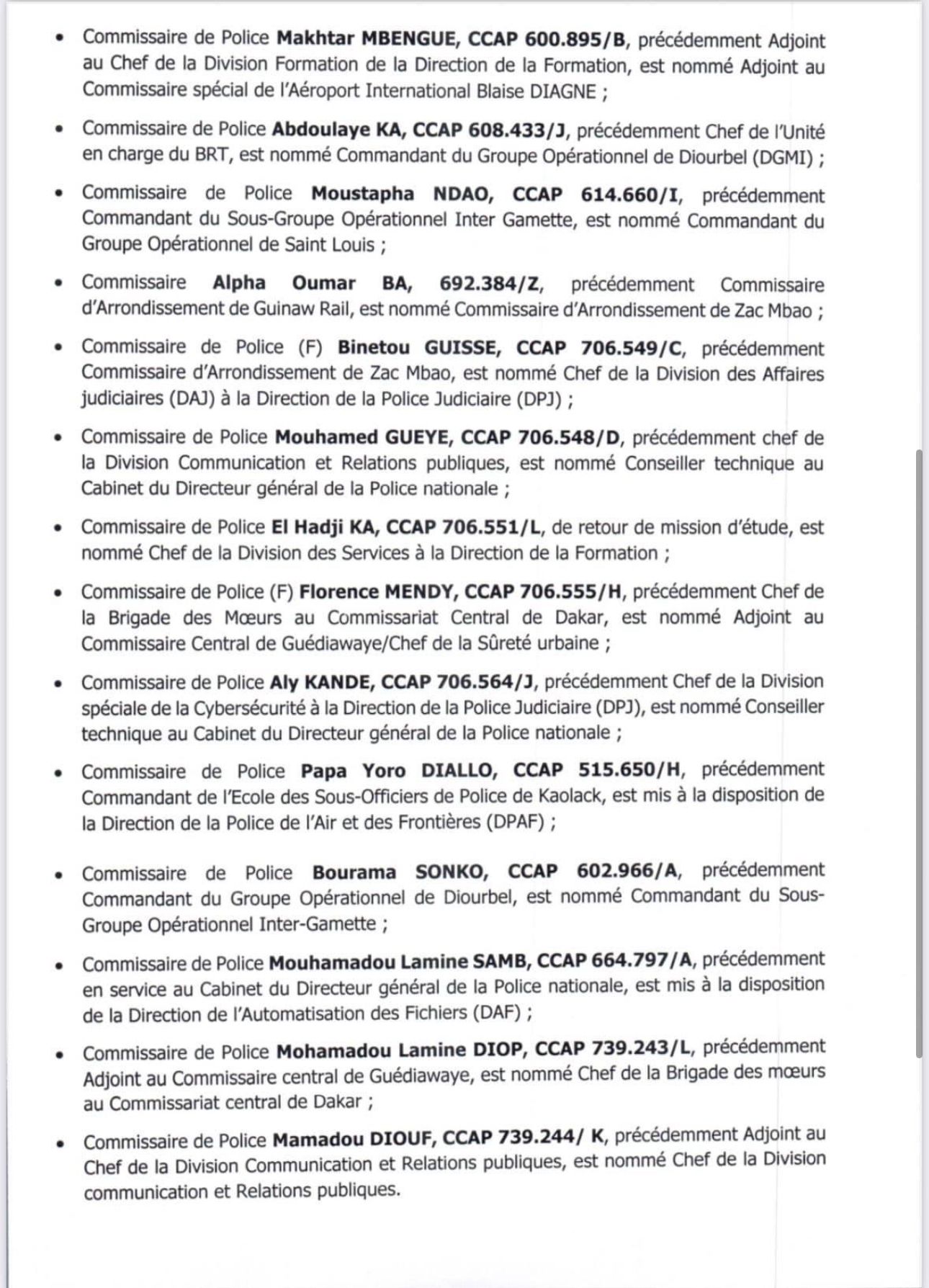 - Commissaire Alpha Oumar BA, 692.384/Z, précédemment Commissaire d’Arrondissement de Guinaw Rail, est nommé Commissaire d’Arrondissement de Zac Mbao ;