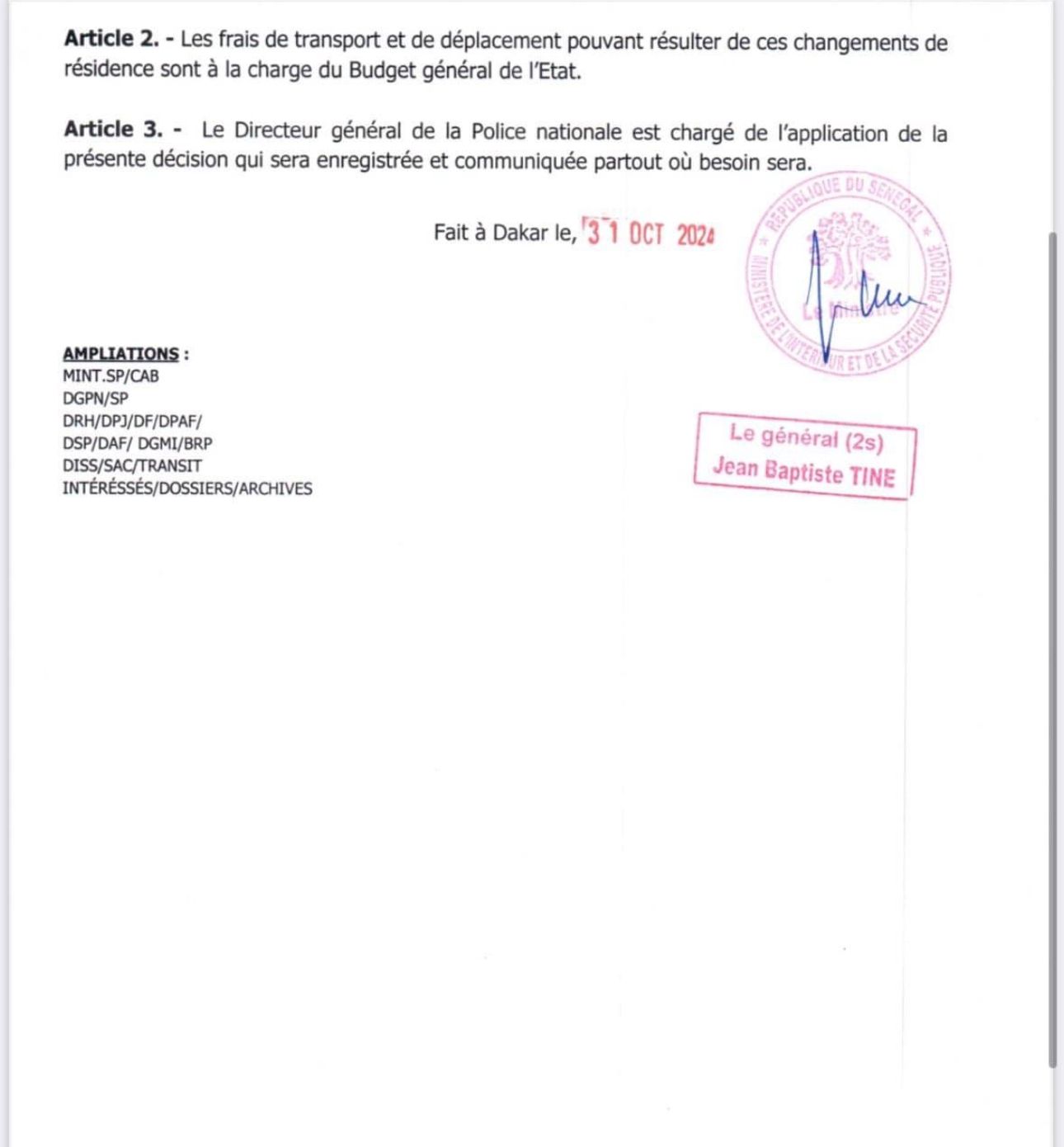 - Commissaire de Police Mouhamadou Lamine SAMB, CCAP 664.797/A, précédemment en service au Cabinet du Directeur général de la Police nationale, est mis à la disposition de la Direction de l’Automatisation des Fichiers (DAF) ;