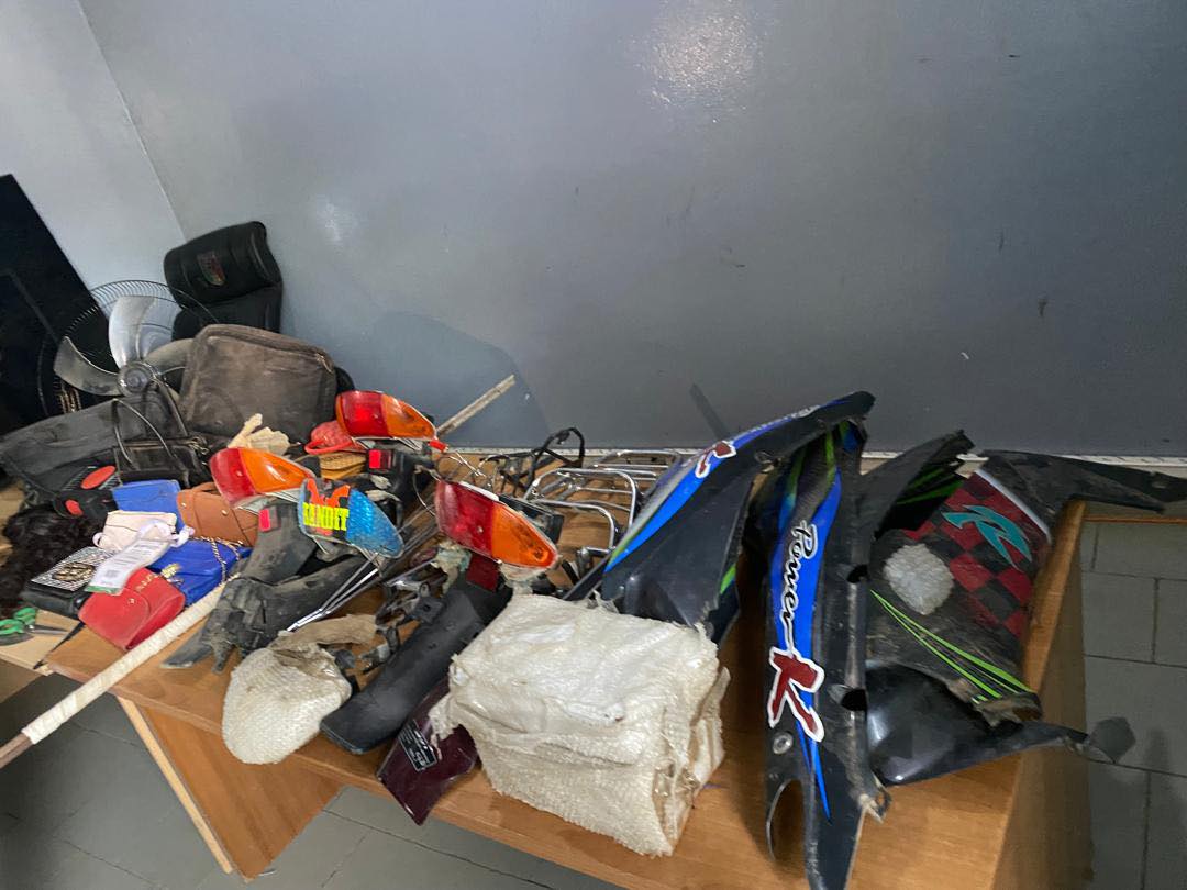 Trois téléviseurs écran plat, Douze téléphones portables, Des greffages et des sacs à main pour hommes et femmes, Des pièces détachées pour motos Jakarta, Un ordinateur portable, Une machette et une somme de 1.500.000 FCFA.