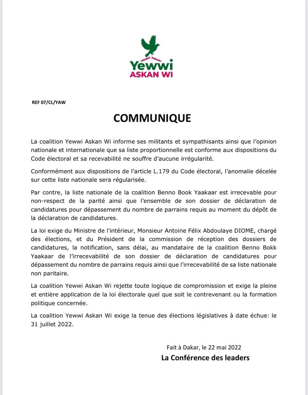 La coalition Yewwi Askan Wi vient de réagir suite à l'annonce de l'invalidation de sa liste par Benno Book Yaakaar hier samedi. Pour la conférence des leaders de Yaw leur liste est conforme aux dispositions du code électorale et sa recevabilité ne souffre d'aucune irrégularité.